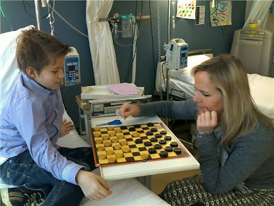 Vanochtend weer lekker staan aanschuiven bij de parkeergarage en om 10.40 waren we op de poli want daar gingen we aanprikken. Nou dat was ook niet de bedoeling we moesten gelijk naar 2 Zuid daar aangekomen kwamen we allemaal bekende zusters tegen van 5 jaar geleden. Ze vonden Ferenc allemaal zo veranderd maar ja dat is ook niet zo gek toen was hij 4,5 en nu 9. De arts heeft gelijk het infuus gezet en nog maar is gevraagd of hij nou moest blijven vannacht ja voor PAC vervanging 24 uur blijven ok daarna door naar het Dijkzigt maar toen was Ferenc een beetje eigenwijs want hij wilde binnen door lopen maar dan weet ik de weg dus niet daar is het net een doolhof weet je dat nou nog niet na 5 jaar zegt ie net of ik daar dagelijks loop. Nou met een hoop mokken eindelijk in het Dijkzigt stofje toegediend en weer terug lopen. Hij stond er voor 11.45 op op de O.K. eerst weer zo'n mooie ziekenhuis pyama uitgezocht en daarna naar zaal waar nog 1 kind lag. Ze hadden iets uitloop maar om 12.30 mocht hij naar boven komen.